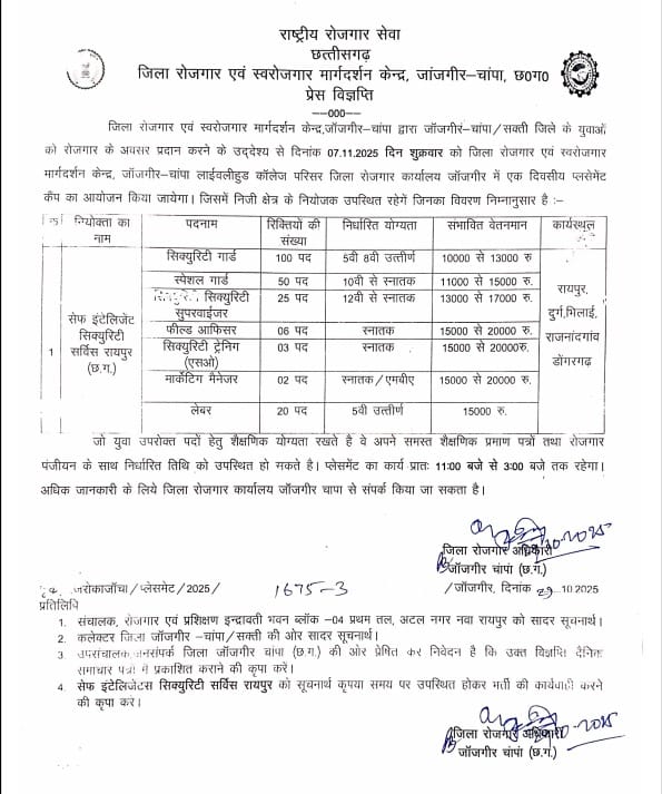 Janjgir-Champa: जिला रोजगार एवं स्वरोजगार मार्गदर्शन केन्द्र, जांजगीर–चांपा द्वारा जांजगीर–चांपा / समीपवर्ती जिले के युवाओं के रोजगार के अवसर प्रदान करने के उद्देश्य से दिनांक 07.11.2025 दिन शुक्रवार को जिला रोजगार कार्यालय परिसर में एक दिवसीय प्लेसमेंट कैंप का आयोजन किया जा रहा है।