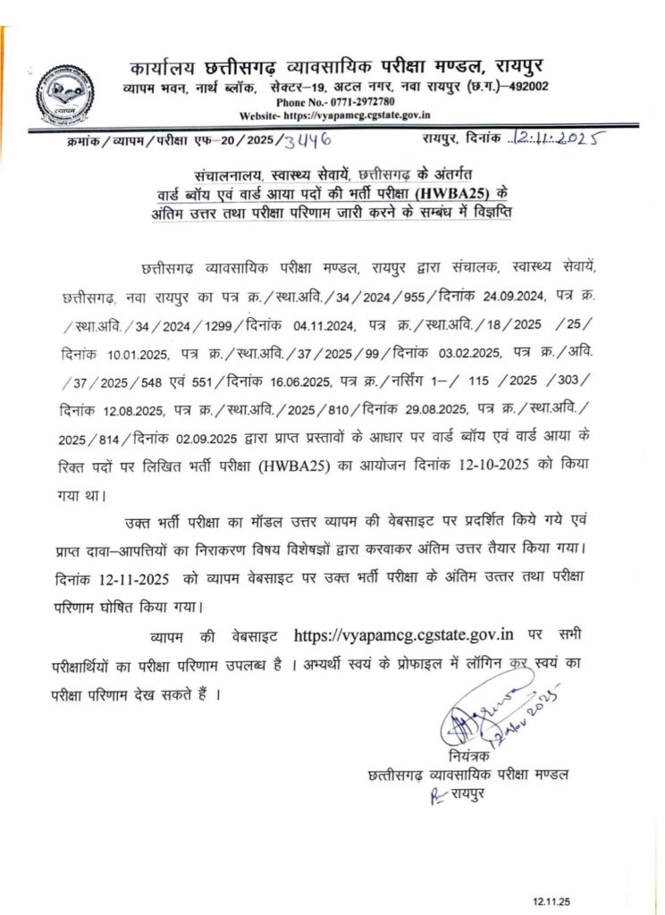 Ward Aya / Boy: छत्तीसगढ़ व्यावसायिक परीक्षा मंडल (CG व्यापम) ने विज्ञापन कोड HWBA25 के अंतर्गत वार्ड बॉय और वार्ड आया के पदों की भर्ती परीक्षा की मॉडल उत्तर कुंजी आधिकारिक तौर पर जारी कर दी है। वार्ड बॉय और वार्ड आया के पदों के लिए लिखित परीक्षा 12 अक्टूबर 2025 को सुबह 11:00 बजे से दोपहर 1:15 बजे तक आयोजित की गई थी।