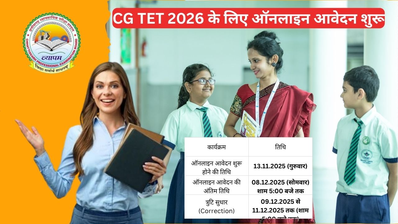CG TET 2026:राज्य शैक्षिक अनुसंधान और प्रशिक्षण परिषद् (SCERT), छत्तीसगढ़ द्वारा छत्तीसगढ़ शिक्षक पात्रता परीक्षा (CG TET 2026) के लिए ऑनलाइन आवेदन प्रक्रिया शुरू कर दी गई है। प्राथमिक और उच्च प्राथमिक स्तर पर शिक्षक बनने के इच्छुक उम्मीदवार अब ऑनलाइन आवेदन कर सकते हैं।