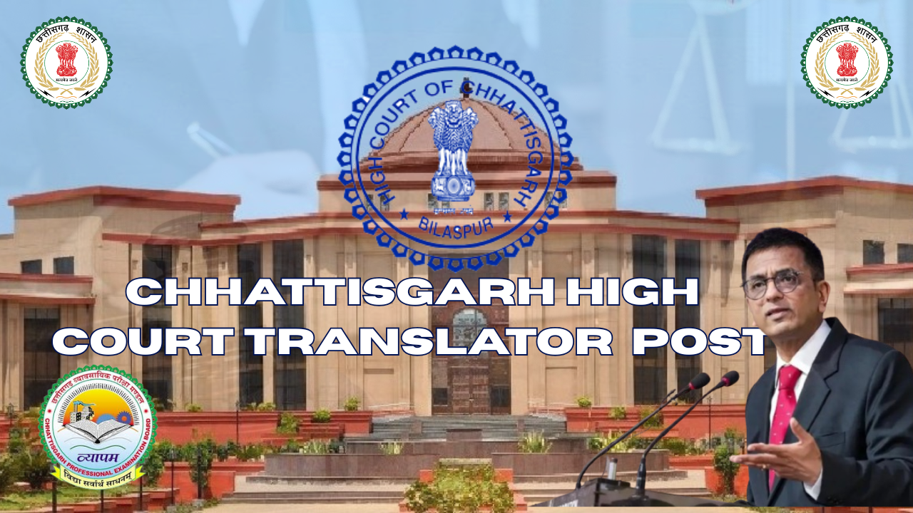 Translator: छ.ग. व्यापम, नवा रायपुर द्वारा माननीय रजिस्ट्रार जनरल, छत्तीसगढ़ उच्च न्यायालय, बिलासपुर, (छ.ग.) का पत्र क्र. 15186 / भर्ती / 2024/II-14-1/2024, दिनांक 20.09.2024, पत्र क्र. 8651/II-14-1/2025, दिनांक 05.05.2025, पत्र क्र. 18775/ II-14-1/2025, दिनांक 18.09.2025. द्वारा प्राप्त प्रस्तावों के आधार पर अनुवादक के रिक्त (Translator)पदों पर लिखित भर्ती परीक्षा के लिए ऑनलाइन आवेदन हेतु परीक्षा का कार्यक्रम निर्धारित किया गया है।
